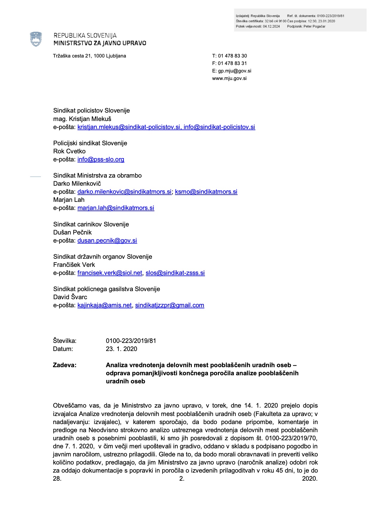 IO PSS je 21.1.2020 iz odziva MNZ na napoved opozorilne stavke SPS zaznal, da je bil rok za Analizo vrednotenja delovnih mest PUO iz II. točke Stavkovnega sporazuma med Vlado in izvajalcem ponovno podaljšan in sicer do 28.2.2020. Ker v IO PSS o ponovnem podaljšanju roka niso bili seznanjeni, so nemudoma zahtevali pisna pojasnila, ki so jih prejeli včeraj (priponka).